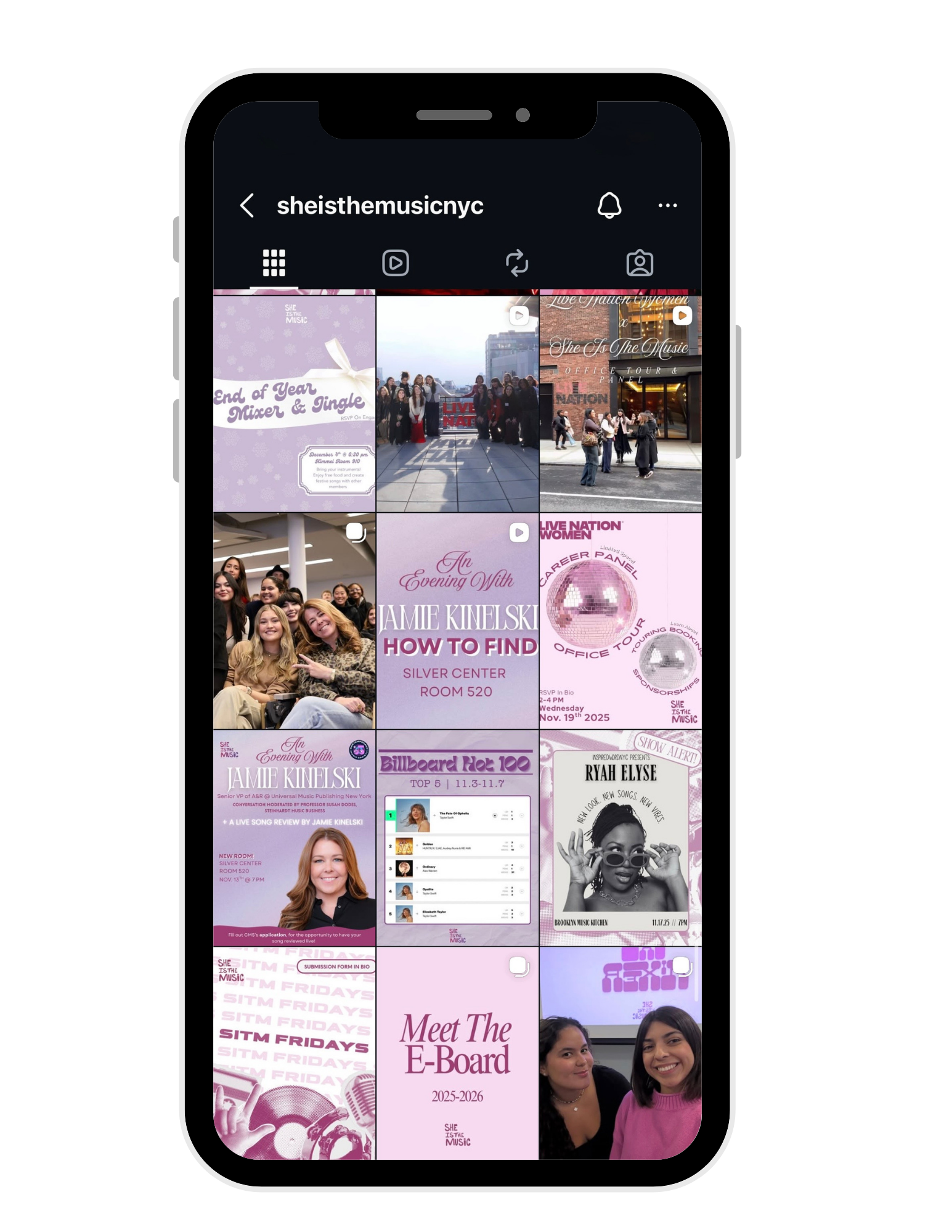 Incorporate She Is The Music and NYU branding through usage of organizations’ colors and aesthetic trends